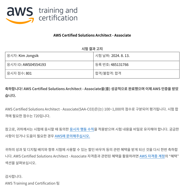 사실 자격증은 큰 의미가 없고 시험에서 얻은 AWS 지식들이 아주 도움이 되고 있다고 생각한다.